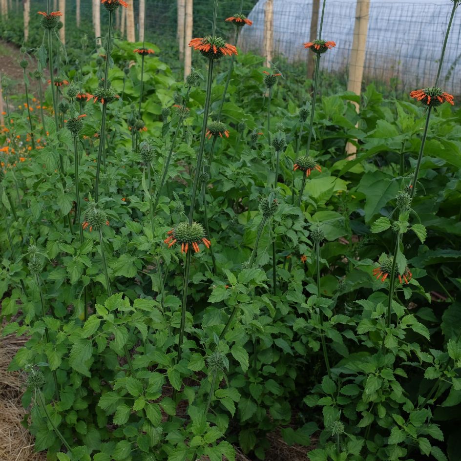 Le Leonotis nepetifolia est une plante pouvant atteindre 3 mètres en hauteur. De juillet aux gelées apparaissent des fleurs de couleur orange clair disposées en verticilles compacts. Cette plante est imposante par son volume et peut aider à structurer un massif.