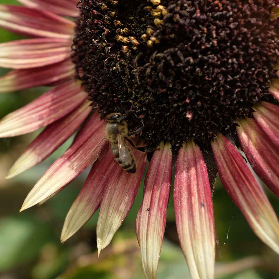 Le tournesol Mrs Mars est une variété annuelle remarquable. Sa floraison bicolore est unique. Contrairement aux tournesols classiques, il se distingue par ses pétales rouge bordeaux profond, qui s’éclaircissent vers l’extérieur pour laisser apparaître des tons crème ou jaunes, créant un effet visuel saisissant.