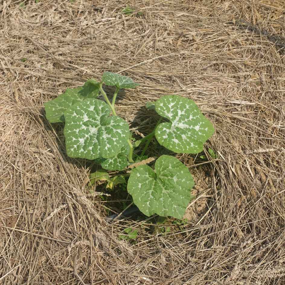 Plusieurs Plants de courge musquée Carat avec un paillage en foin. vue de loin.