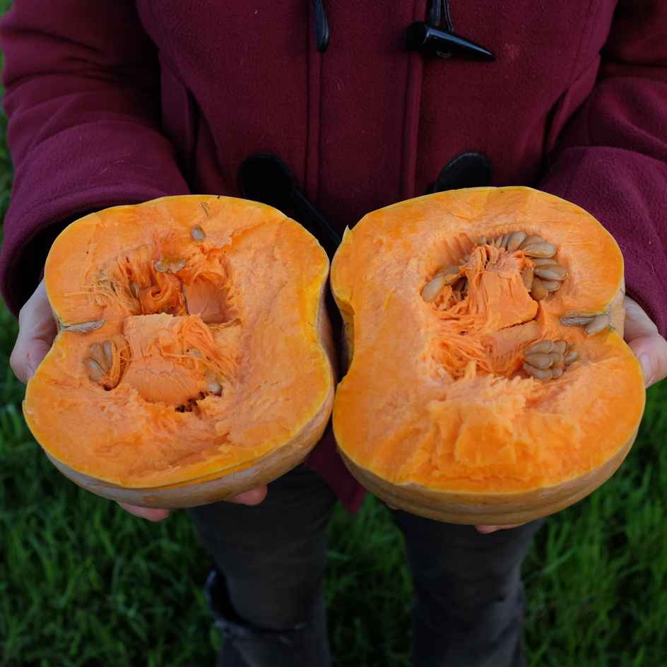 courge carat fruit coupé en deux chair orange avec graines