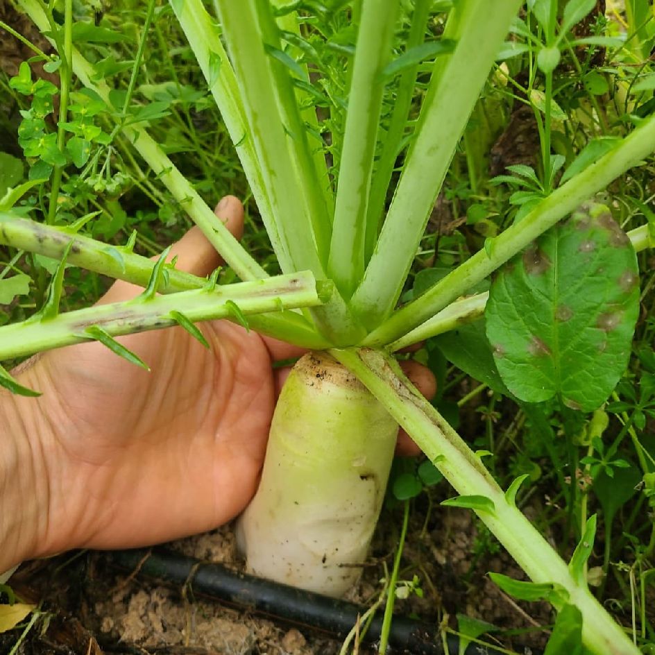 Le radis Daikon est le cousin asiatique du radis noir, mais il est plus long, plus épais, à la peau blanche et au collet vert. Très bon il est également moins fibreux, plus juteux, plus sucré et nettement moins piquant.Excellent en jus ou en crudité, il est adoré des enfants. Il se conservera néanmoins moins bien que le radis noir.