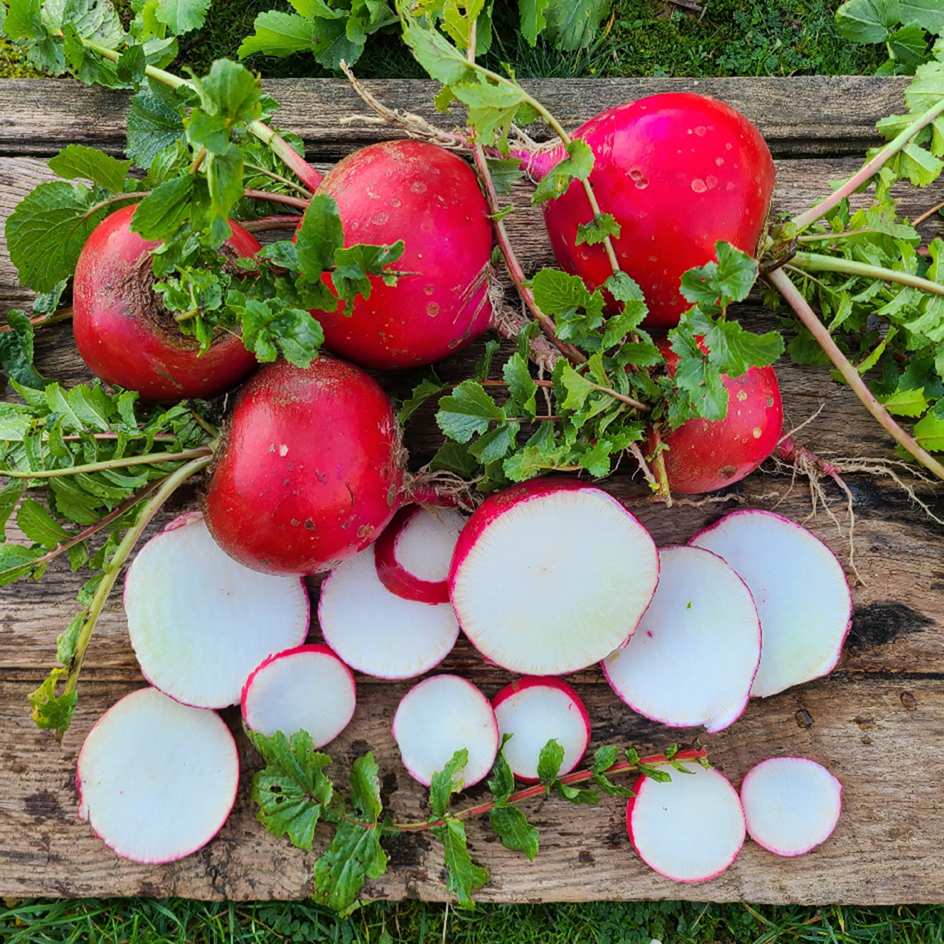 Le radis Misato Red bio donne un radis rond, rouge sans collet et de gros diamètre (10 centimètres). La chair blanche est juteuse, douce et elle se consomme crue en salade ou cuite.