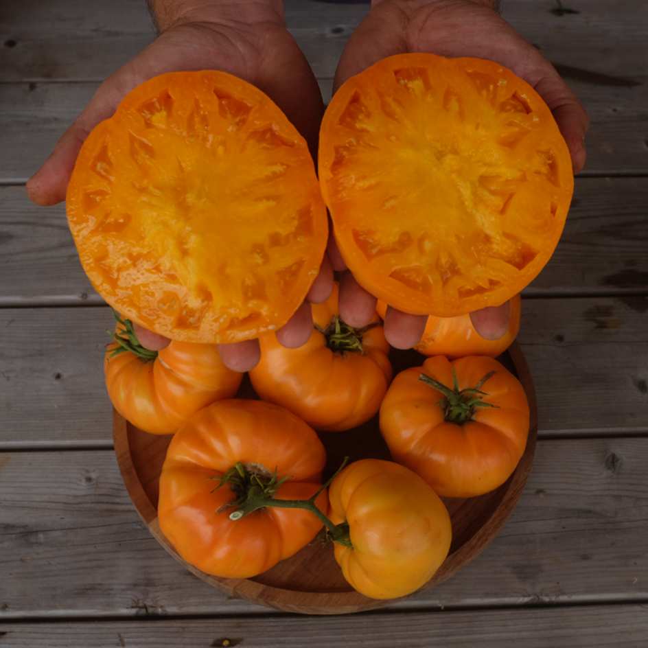 Gros fruits jaune d’or de type beefsteak, pouvant aller de 250 à 800 grammes. Leur forme est aplatie, avec des épaules irrégulièrement côtelées. La chair offre une texture dense et ferme. Sa saveur est assez riche et intense.